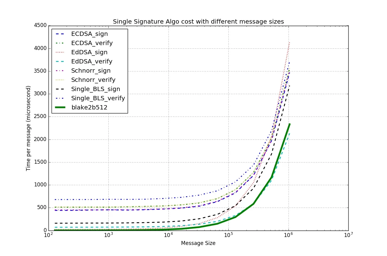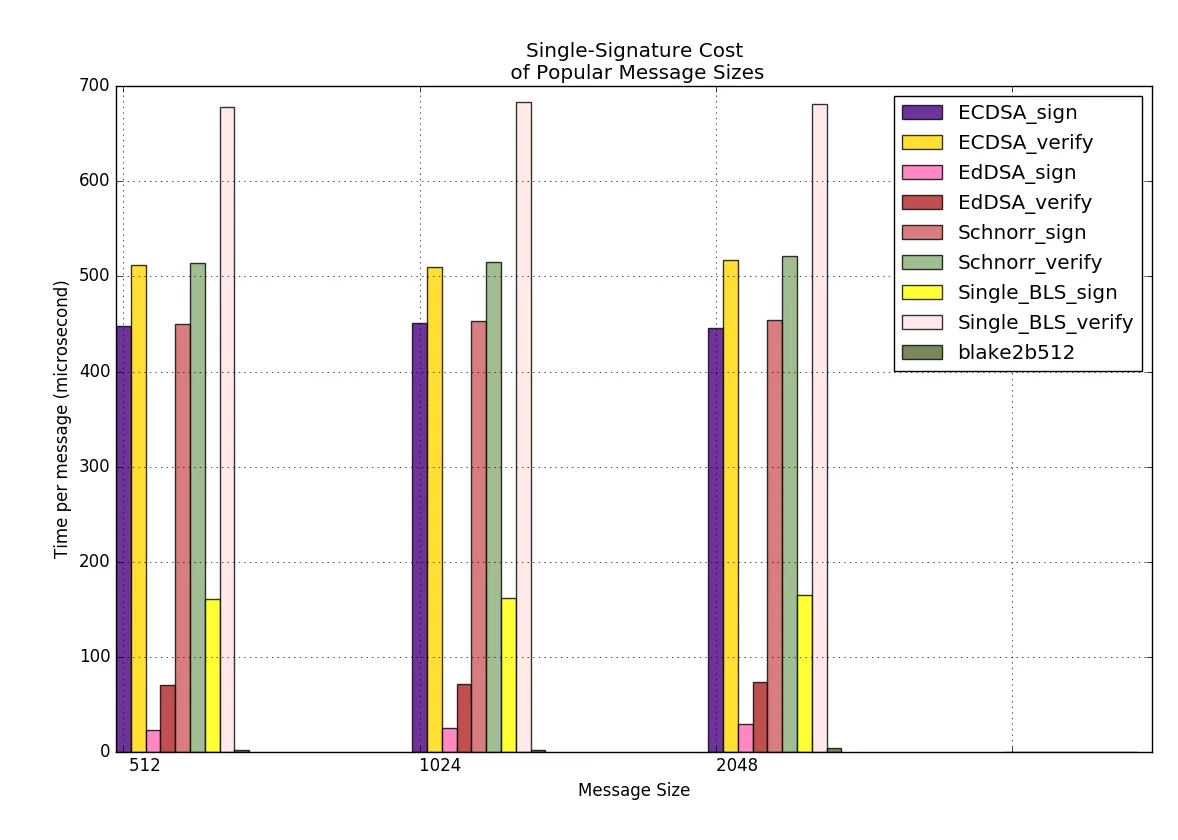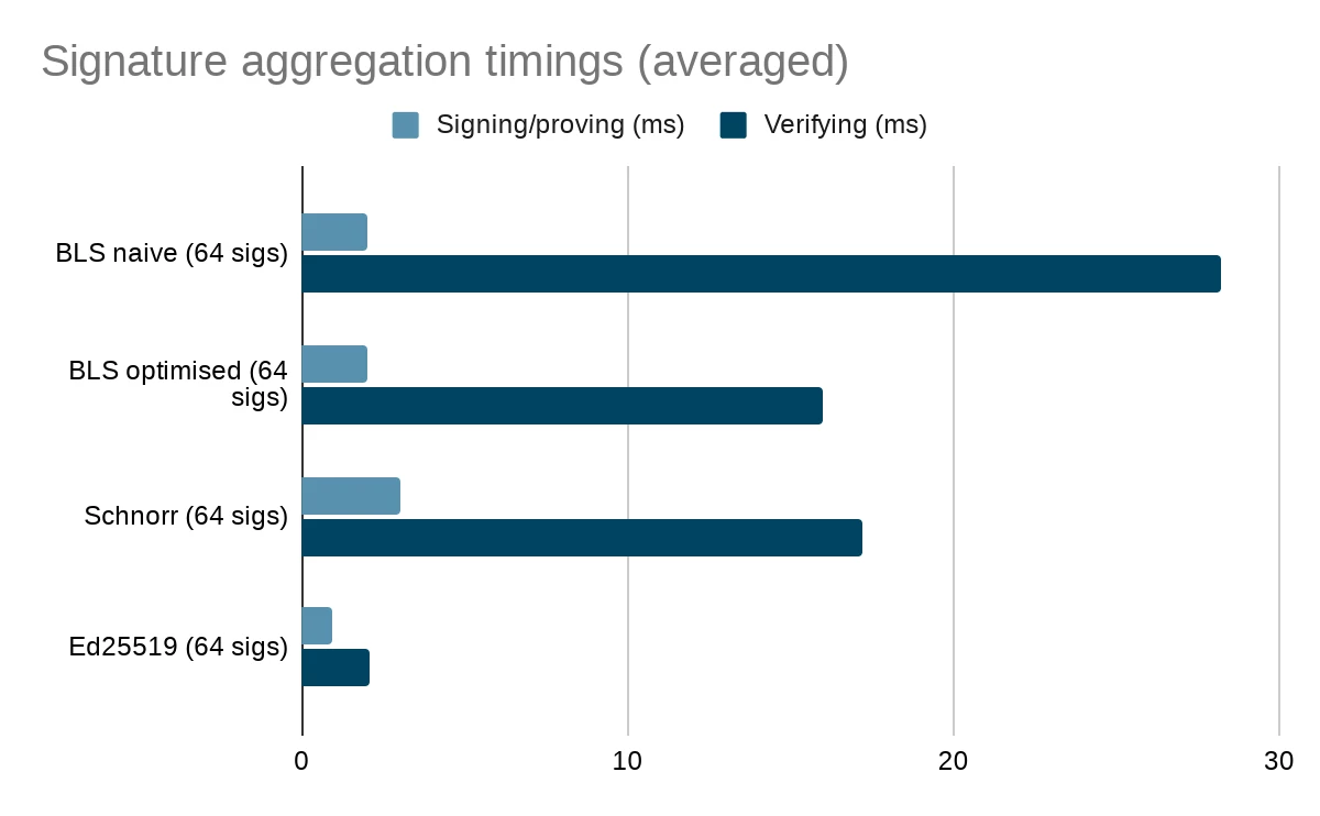 BLS: on paper, aggregated Schnorr signatures are quicker than aggregated BLS signatures but in real-life we found the differences to be negligible, with the verification for BLS even being quicker for large numbers of signatures. There are also highly optimised versions of BLS that perform far better than any Schnorr implementation we could find. The extensibility to BLS as well as the ability to hide transactions through m-out-of-n multisig aggregation, within aggregated BLS signatures made them the more attractive choice.