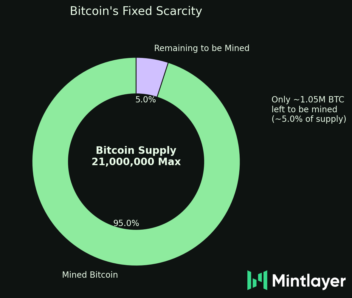Currently, over 19.95 million Bitcoin have been created, leaving fewer than 1.05 million left to be issued over the next century. Compare this to traditional currencies, where central banks create new money whenever they choose. Bitcoin's supply is mathematically capped and transparent.