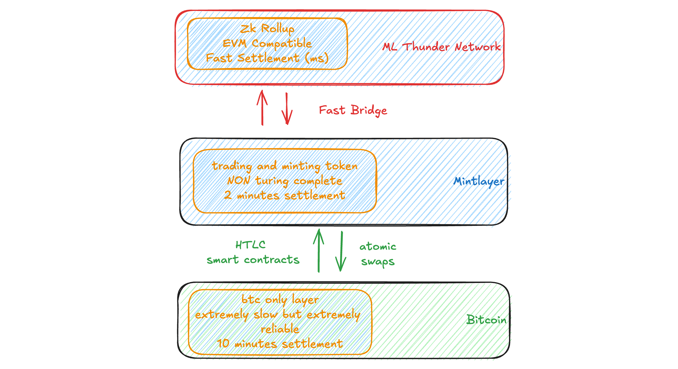 Mintlayer L2 enhances interoperability through Native BTC Cross Chain Swaps using Hash Time Locked Contracts, allowing direct swaps between Bitcoin, ML coins, and other Mintlayer-minted assets. While faster than Bitcoin with a settlement time of approximately 2 minutes, L2 prioritizes security and reliability, leveraging non-Turing complete smart contracts and a UTXO model inspired by Bitcoin’s architecture. - Layer 3: Mintlayer ZK Thunder Network